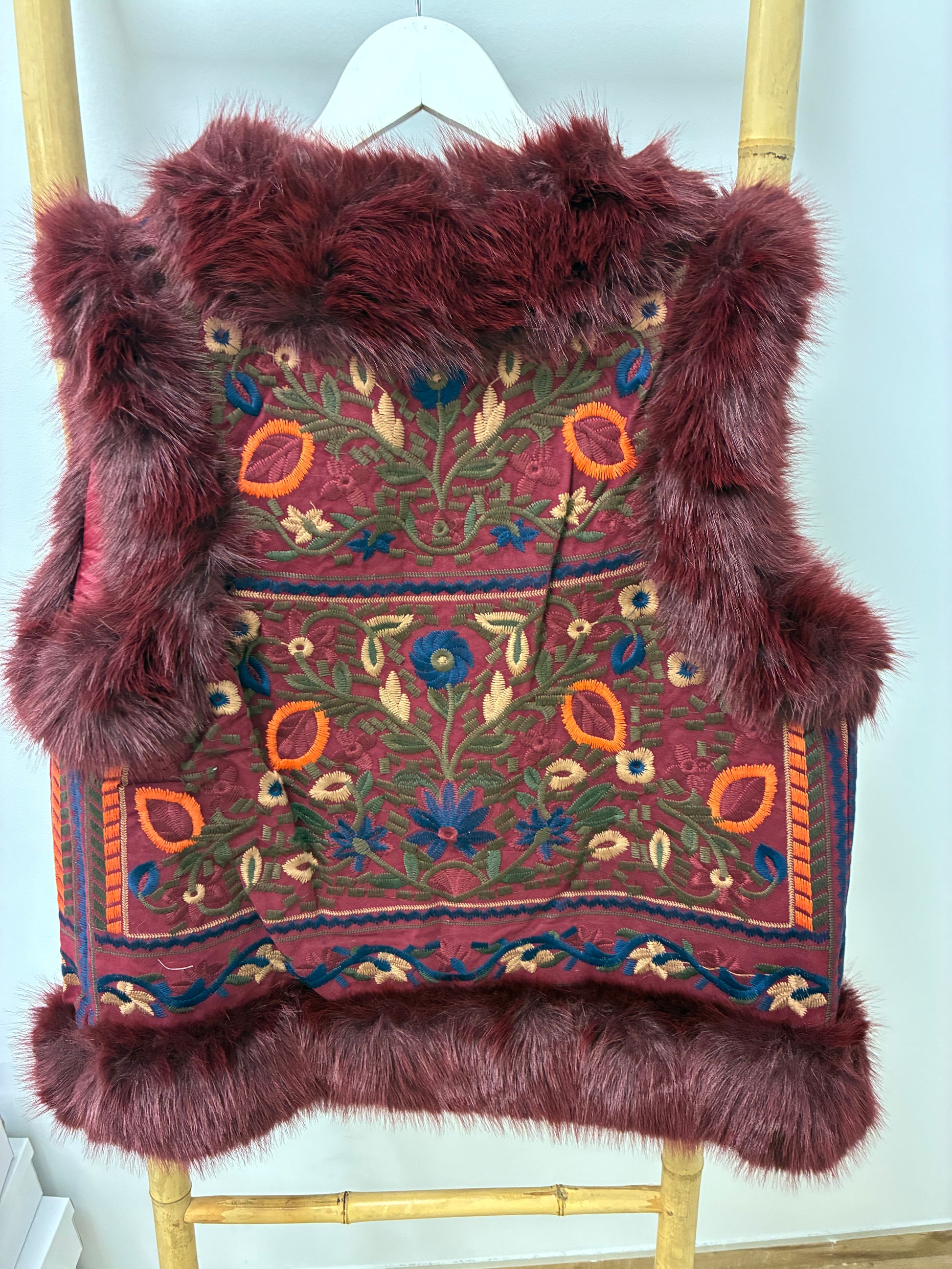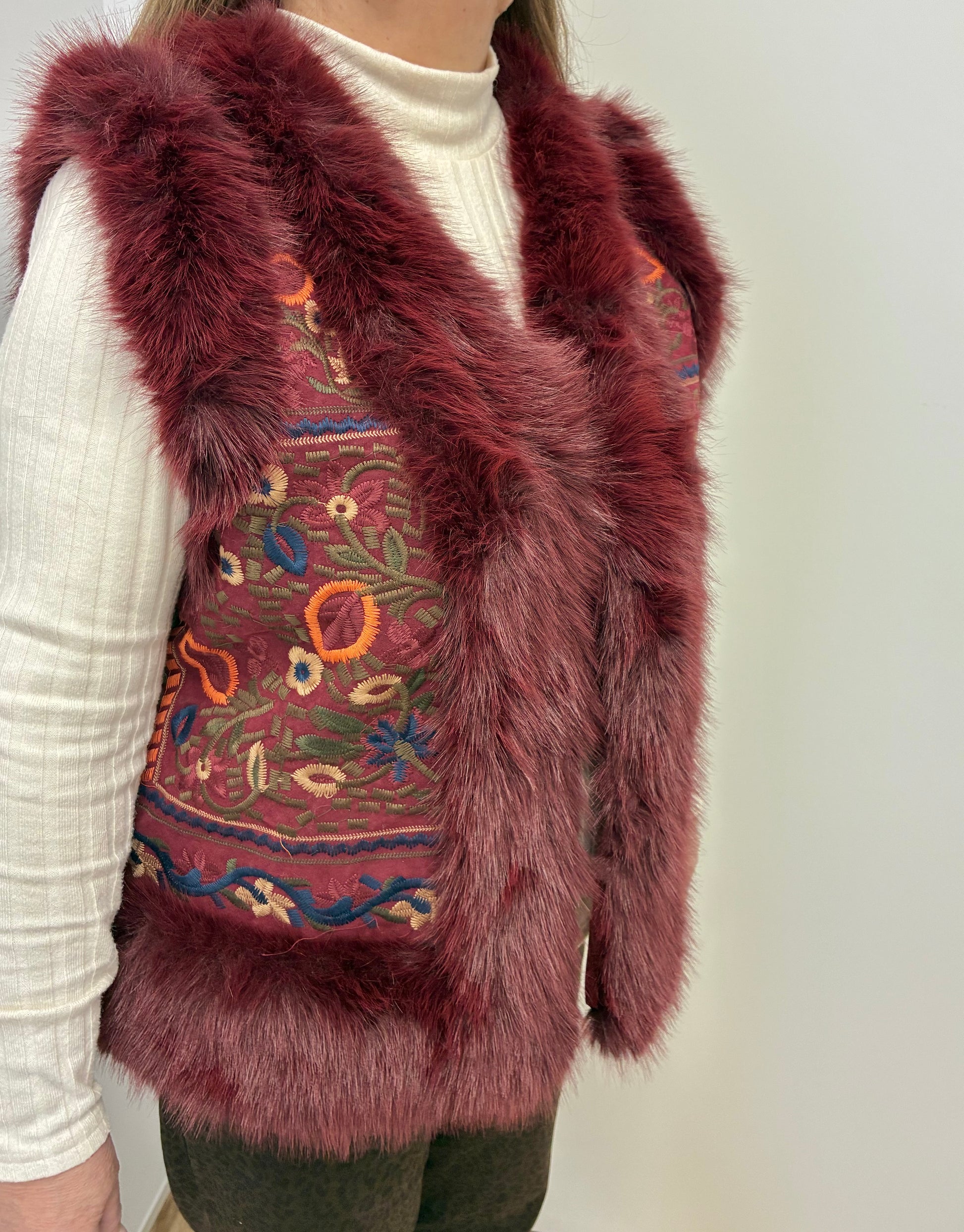 Este chaleco bordado con pelo en un elegante diseño de flores en color burdeos. La combinación de bordados finos y suaves proporciona un aspecto sofisticado y elegante, perfecto para cualquier ocasión. Añade un toque de estilo a tu atuendo con este chaleco de alta calidad.