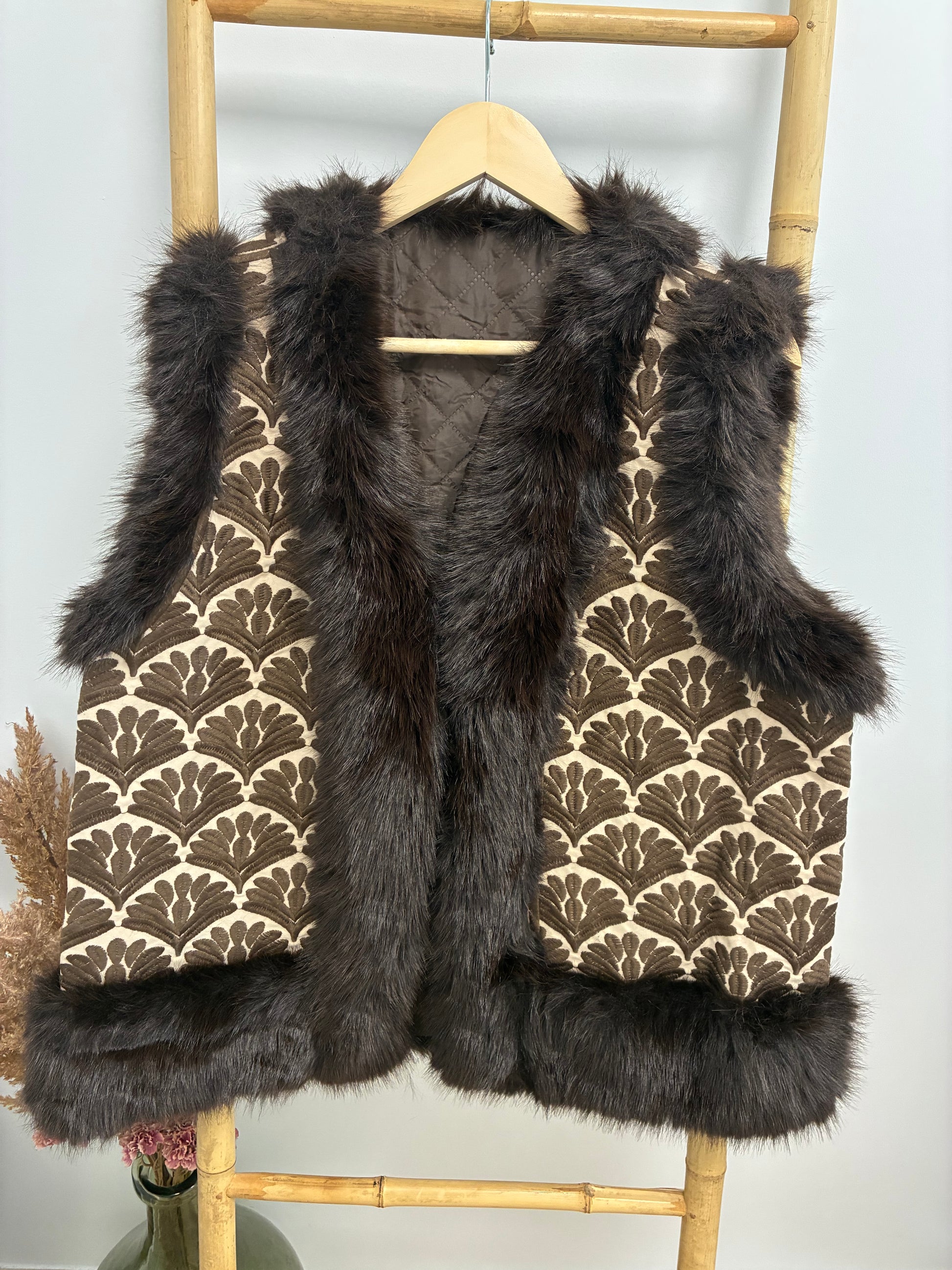 Este chaleco Florencia de pelo marrón chocolate es una excelente opción para mantenerse abrigado y a la moda. Con su hermoso estampado, este chaleco no solo te mantendrá caliente, sino que también te hará destacar en cualquier ocasión. Hecho con materiales de calidad, este chaleco te brindará comodidad y estilo.
